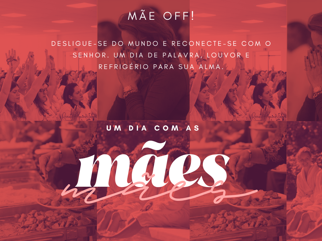 O “Mãe Off!” é um evento pensado exclusivamente para você, mãe, que vive uma rotina intensa e precisa de um momento de pausa para cuidar da sua espiritualidade e bem-estar. Será um dia inesquecível de palavra, louvor e, acima de tudo, um profundo refrigério para a sua alma.